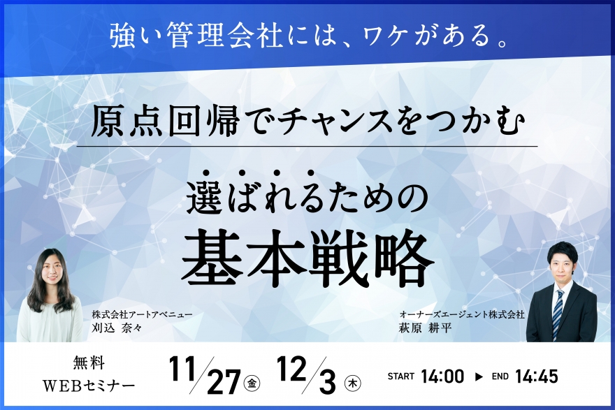 当セミナーでは、基本戦略のベースとなる「他社との差別化が図れる管理商品」と、効果的な「サービスの見える化」について具体的なアイデアをもとにご紹介していきます。