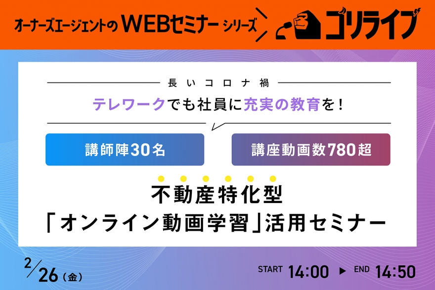 【ゴリライブ】テレワークでも社員に充実の教育を! 不動産特化型「オンライン動画学習」活用セミナー(無料・WEB開催)